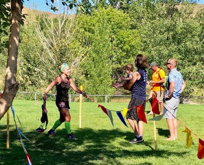 This is where I will definitely need to find room for improvement. The fact that I had no first-hand visual of what this route looked like was a mental struggle for me. It was also starting to get warm and we were pretty spaced out on the course. I felt very alone on this long segment. I did not realize how many late-in-the-first-half of this loop coulee climbs there would be. I think there were at least 3 that I didn’t expect to happen. My stomach was bothering me and I was crabby. I really thought I would be falling being my goal here and I was starting to come to terms with it. As soon as I realized we had crossed the bridge to the other side of the lake and were heading BACK to Pavan, my spirits were lifted. I also found a fellow runner who was training for NYC Marathon with us on the weekends, Steven, and we ran a bit together which was nice. It was also a huge mental boost coming in to the aide station and seeing Dan with Andy.