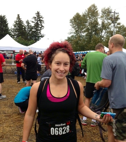 I am most proud of being able to do the monkey bars all by myself on Saturday (and Sunday!) I didn’t hit the spear throw, so now I still have only made the spear once in all my races. The course for Saturday was 14 kilometers of fun, and I am so happy I had an early heat as it started to really warm up later. I would not have been able to run as well as I did if I had been later in the day. I finished in a time of 1:42.14, which was 327/2327 overall, 24/1008 females, and 8/222 in the F 30-34 age group in the Open category. Oh, and that parking spot? Came in handy because as I walked back to my car to change before heading to the beer garden (which didn’t have a free beer for us, even though a coupon was accidentally enclosed in everyone’s packs on Saturday…apparently Spartan Canada couldn’t secure a beer sponsor this year so no free beer!) a dad and his kids had a lemonade stand set up. And a sign offering a hot shower for $3! I inquired and I went and rinsed off on their patio with the hot water hose, and then his wife led me to a change area set up in their mud room. The hot shower, lemonade and tip put me back $8, and it was worth every penny!