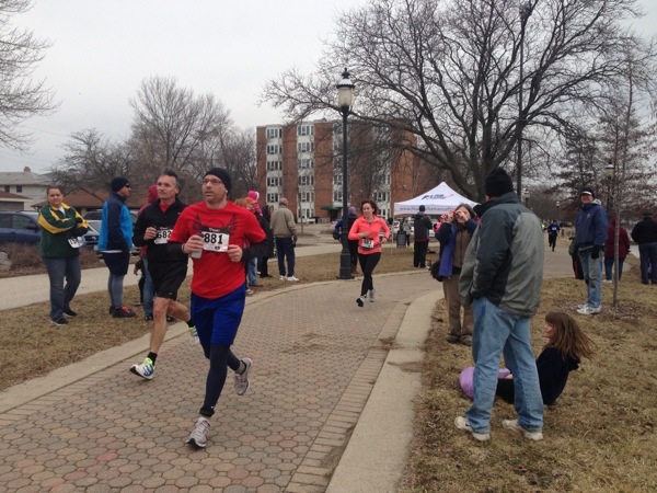 I really didn’t know what to expect from this race, as I had eaten and drank too many Wisconsin indulgences over the course of me being home.  In my mind, I had a lose goal of breaking 1:40.  (My personal best is a high 1:35, which I ran last year at the Calgary Hypothermic Half).  I ran a mile warm up and realized it would be slippery.  I knew I didn’t want to fall or do anything stupid, which would then ruin my ability to run in Boston, so I thought that maybe just taking it easy and being in the mid 7:30s-7:50s may be best.  Either way, 9:30 hit and I was off.